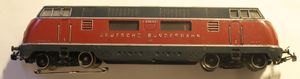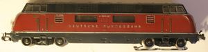 Diesel Locomotive, modelled on the German Federal Railways Class V 200. Eight wheeled 0-4-4-0 type. Both axles of the rear bogie are driven. Remore control reversing gear with additional hand leaver. Plastic tyres on driving wheels, giving particulary high tractive effort. Two electric headlights front and rear automatically switch over when the locomotive reverses. Red/blue/black all-metal case with numerous details. Silver roof. Windows with cellon panes. Automatic couplings both ends. Length over buffers 8½ in., weight aproximately 19ozs.